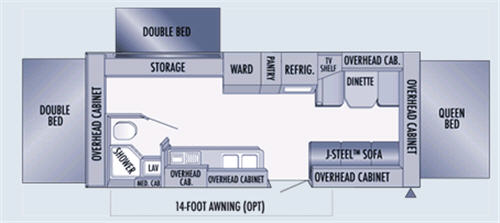 Double & Queen Tent End Beds, 2nd Double Bed Tent Side, Shower, Medicine Cabinet, Double Kitchen Sink, Wardrobe, Pantry, TV Shelf, Refrigerator, Dinette, J-Steel Sofa, Overhead Cabinet Space, and More.