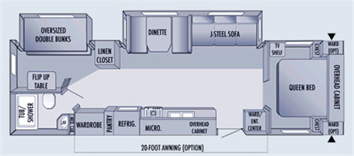 Oversized Bunk Beds, Flip-Up Table, Tub/Shower, Linen Closet, Wardrobe, Pantry, Refrigerator, Microwave Above Range, Double Kitchen Sink, Dinette w/Extendable Seating Option, J-Steel Sofa, Wardrobe/Ent. Center, Queen Bed, TV Shelf, Opt. Wardrobes Above Chests, Overhead Cabinets, and More.