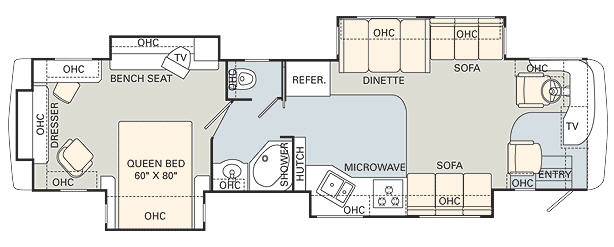 Quad Slide, Rear Large Bedroom w/Queen Bed Slide, Bench Seat/TV Slideout, Desk w/Chair, Dresser w/Overhead Storage, Lounge Chair, Seperate Stool Room, Angle Shower, Hutch, Refrigerator, Double Sink, 3 Burner Range, 2 Sofas, Booth Dinette, TV Above Cab Area And More.