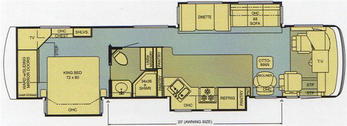 Triple Slide, Rear Ward. w/Sliding Mirrored Doors, TV, Chest, Shelves, King Bed Slide, Overhead Cabinets, Side Isle Bath w/Linen Cabinet, Wash/Dryer, Angle Shower, Lav., Double Bath Entrance, Double Kitchen Sink, Refrig., 3 Burner Range, Pantry, Recliner & Ottoman, Sofa, Booth Dinette & Much More.