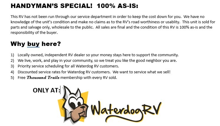 This RV has not been run through our service department in order to keep the cost down for you. We have no knowledge of the unit’s condition and make no claims as to the RV’s road worthiness or usability. This unit is sold for parts and salvage only, wholesale to the public. All sales are final and the condition of this RV is 100% as-is and the responsibility of the buyer.