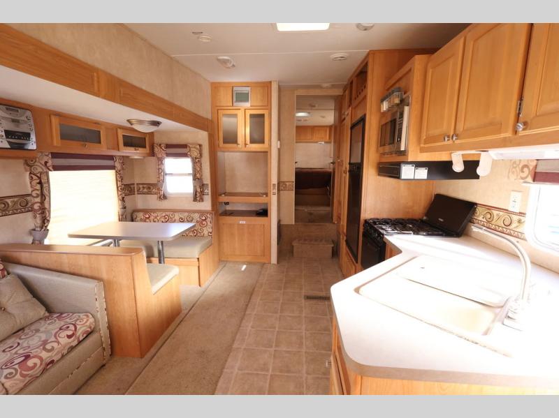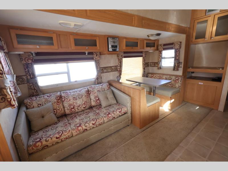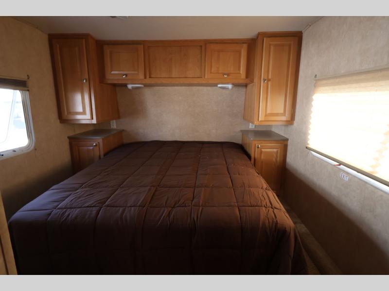 Features May Include, Propane Tank, Stabilizing Jacks, Front Power Leveling Jacks, Front Pass Through Storage, Rear Roof Access Ladder, Hot Water Heater, 1 Slide Out, Patio Awning, A/C, Furnace, Window Shades Throughout, Solid Wood Cabinetry Throughout, (1) Recliner, 3 Burner Range Top W/ Oven, Microwave, Refrigerator, Side by Side Kitchen Sink, Full Bath W/ Shower, Free Standing Dinette, Sofa, Walk Around Queen Bed. Sleeps 5-6