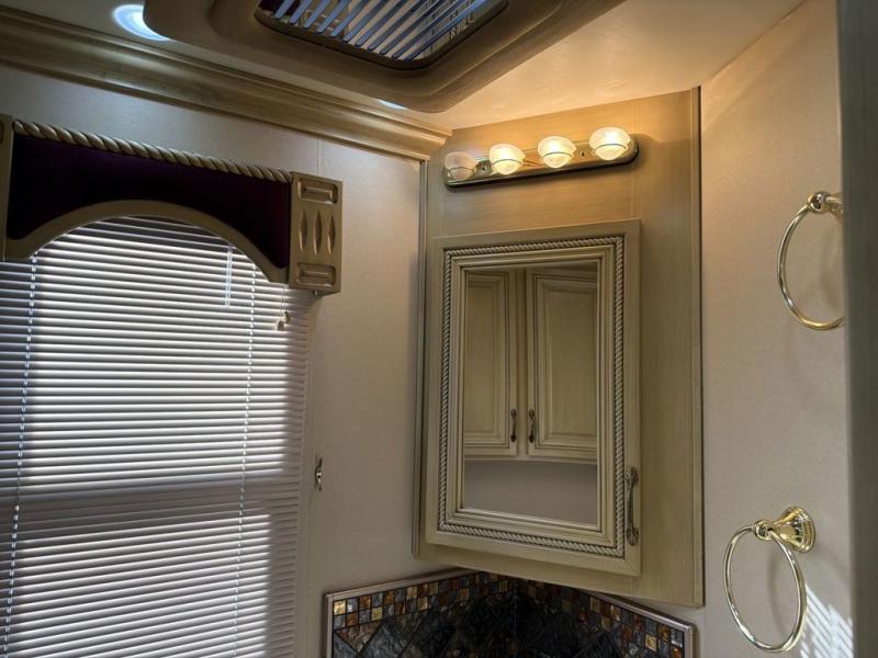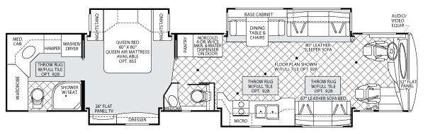 American Eagle Class A Coach w/Bath & a Half, Rear Full Bath w/Washer/Dryer, Lav., Med. Cabinet, Wardrobe, Toilet & Shower w/Seat, Throw Rug w/Full Tile Opt., King Bed Slideout w/Nightstands, 26" Flat Screen TV & Dresser Slide, Pantry, Dining Table & Chairs & Sleeper Sofa Slide, 32" TV Above Cab Area, Leather Sofa Bed/Double Kitchen Sink & 2 Burner Range w/Microwave Above Slide, 1/2 Bath and Much More!