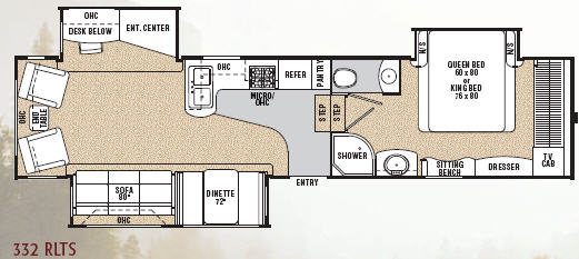 Triple Slides, Rear Living, 2 Chairs w/ End Table, Sofa Bed, Booth Dinnete, Desk, Ent. Center, Full Kitchen, Double Kitchen Sink, 3 Burner Range, Refrigerator, Pantry, Full Bathroom, Corner Shower, Seperate Toilet/Sink, Front Bedroom, Sldie Out Queen Bed, Dresser, Sitting Bench, and More.