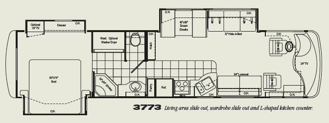 Triple Slide Out, Rear Bedroom, Nightstands, Wardrobe, Bathroom, Kitchen, Pantry, Refrigerator, 3 Burner Range, Double Kitchen Sink, Booth Dinette, Double Sofa, and More.