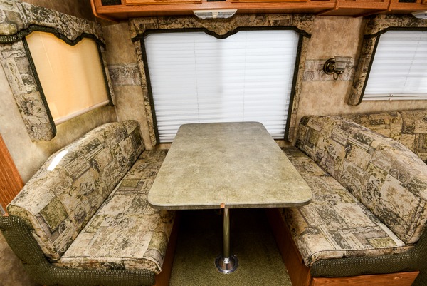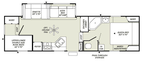 Single Slide, Rear Double Bed Bunks, Wardrobe, Booth Dinette & Sofa Bed Slide, Refrig., 3 Burner Range, Double Kitchen Sink, Ent. Center, Pantry, Seperate Stool Room, Angle Shower, TV Cabinet, Lav., Front Queen Bed w/Wardrobe & Nightstand, Pass-Thru Storage and More.