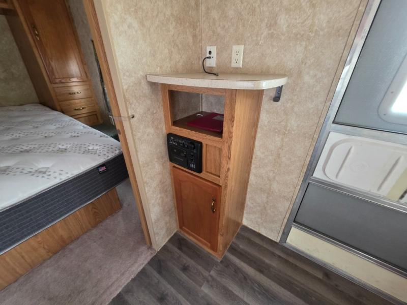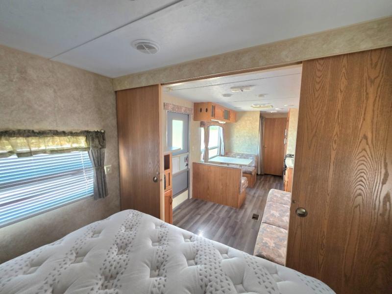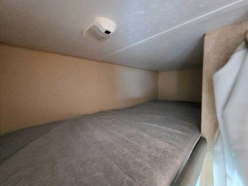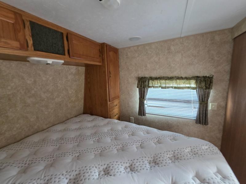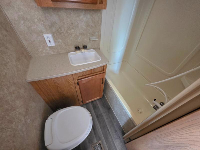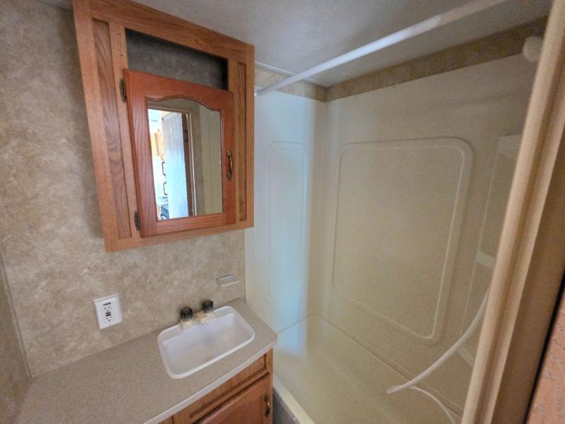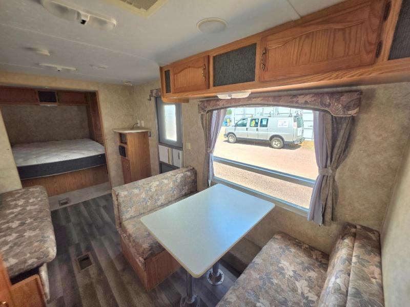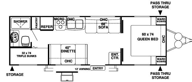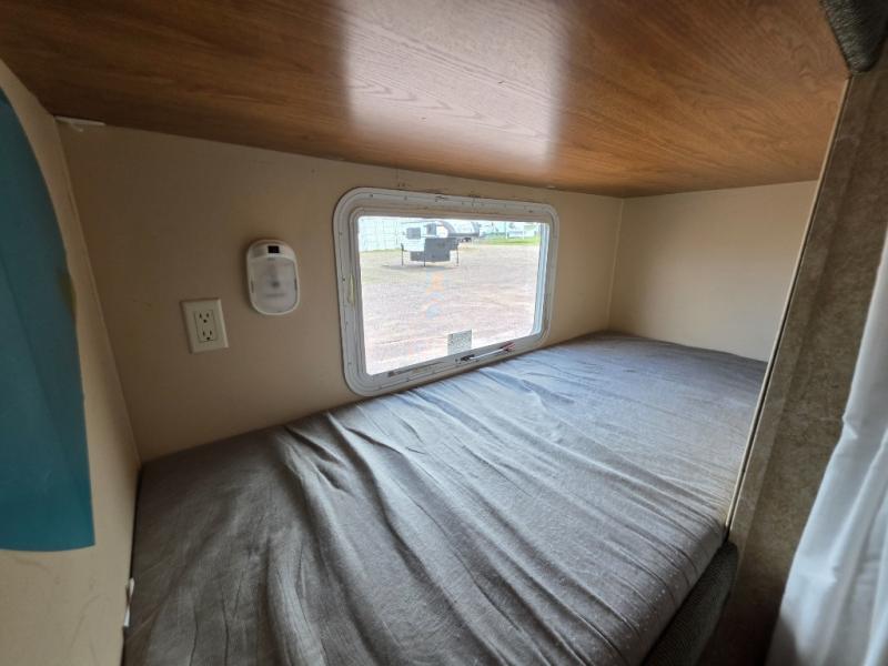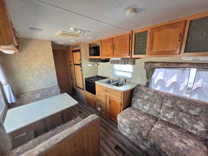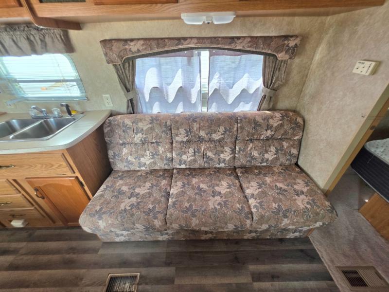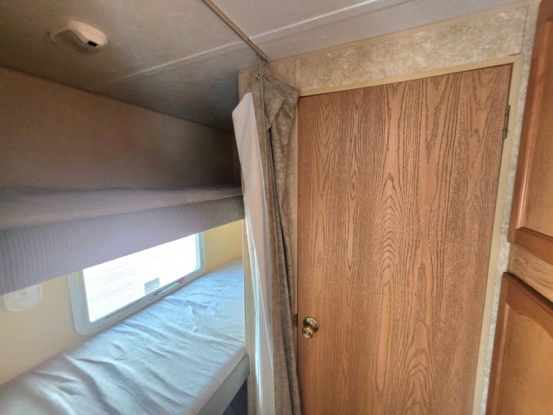 This well cared for camper has a Rear Corner Bath w/Lav., Shower, Med. Cabinet, Refrigerator LP/Electric, Double Kitchen Sink, Sofa, Front Queen Bed w/Wardrobes, Pass-Thru Storage, Ent. Center, Booth Dinette, Overhead Cabinets, Rear Corner Bunks, Exterior Storage & More.