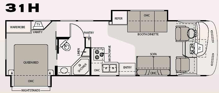 Double Slide, Rear Queen Bed Side Slideout, Nightstands, Wardrobe, TV Above Vanity, Side Isle Bath w/Angle Shower, Linen Closet, Double Entry into Bath, Pantry, 3 Burner Range & Microwave, Double Kitchen Sink, Sofa, Booth Dinette, Refrigerator, TV Above Cab, Choice of Engine & Chassis and More.