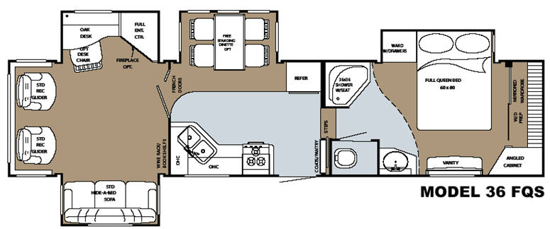 Quad Slide, Rear Living w/2 Recliner Gliders, Hide-A-Bed Sofa, Desk/Ent. Center w/Opt. Fireplace, French Doors into Kitchen w/Dinette & Chairs, Double Sink, 3 Burner Range, Refrig., Pantry, Coat Closet, Shower w/Seat, Stool Room, Lav., Queen Bed Slide, Dresser, Ward. w/Drawers, Angled Cab. & More.