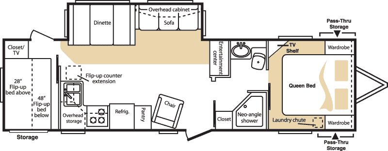 Single Slide, Rear Bunkhouse, Flip Up Bunks w/Lower Oversized, Closet/TV, Booth Dinette & Sofa Slideout, Ent. Center, Lounge Chair, Pantry, Refrig., 3 Burner Range, Overhead Storage, Double Kitchen Sink, Flip Up Counter Extension, Closet, Angle Shower, Lav., TV Shelf, Front Queen Bed w/Wardrobes Both Sides, Laundry Chute, Pass-Thru Storage & Much More.