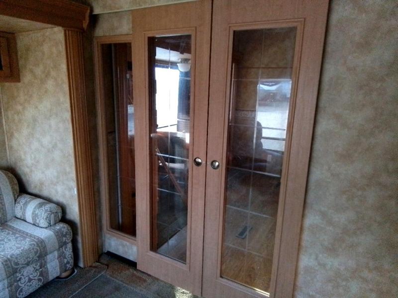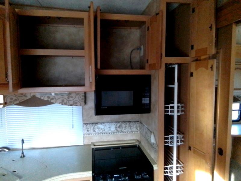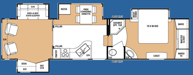 Quad Slide Fifth Wheel w/Rear Living Area Including Lounge Chairs, Hide-A-Bed Sofa Slideout, Desk/Ent. Center Slideout, Pantry, 3 Burner Range, Dbl. Kitchen Sink, Overhead Cabinets, Refrig./Free Standing Dinette Slideout, Shower w/Tub Opt., Private Toilet Area, King Bed Slideout w/Nightstand, Chest of Drawers, Master Closet & More.