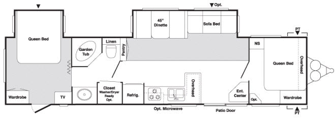 Double Slide, Rear Queen Bed Slideout, Wardrobe, TV, Seperate Bedroom Entrance, Garden Tub, Linen Cabinet, Pantry, Closet w/Opt. Wash/Dryer, Vanity, Booth Dinette, Sofa Bed, Double Sink, 3 Burner Range w/Opt. Micro., Refrig., Ent. Center, Pass-Thru Stor. & More.