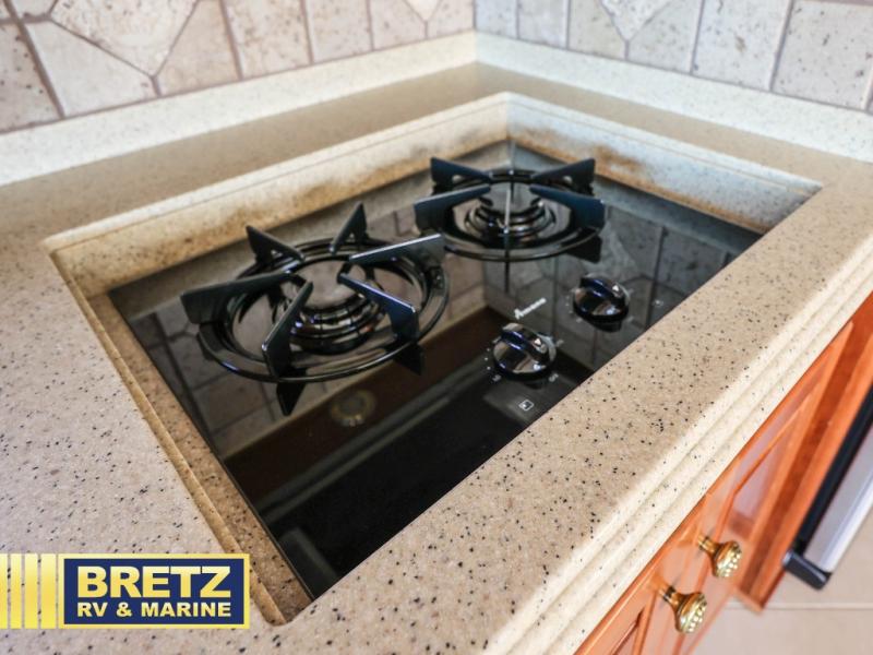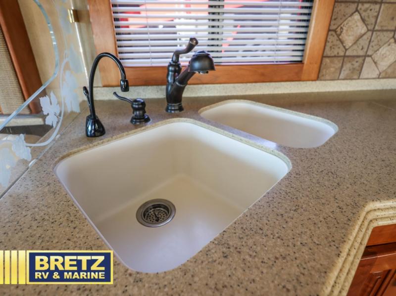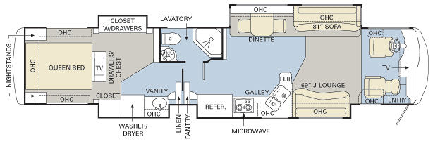 Quad Slide, Queen Bed w/Nightstands, Drawers/Chest w/TV, Closet w/Drawers Slideout, Washer/Dryer/Closet & Vanity Slide, Angle Shower, Linen Cab., Pantry, Refrig., 2 Burner Cooktop/Microwave, Double Sink, Flip Counter, Dinette w/Chairs, Sofa & J-Lounge, TV Above Cab Area