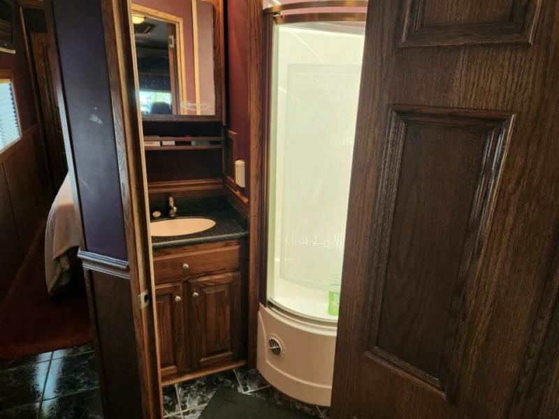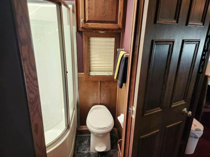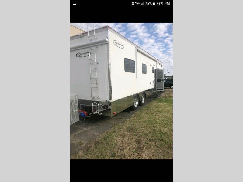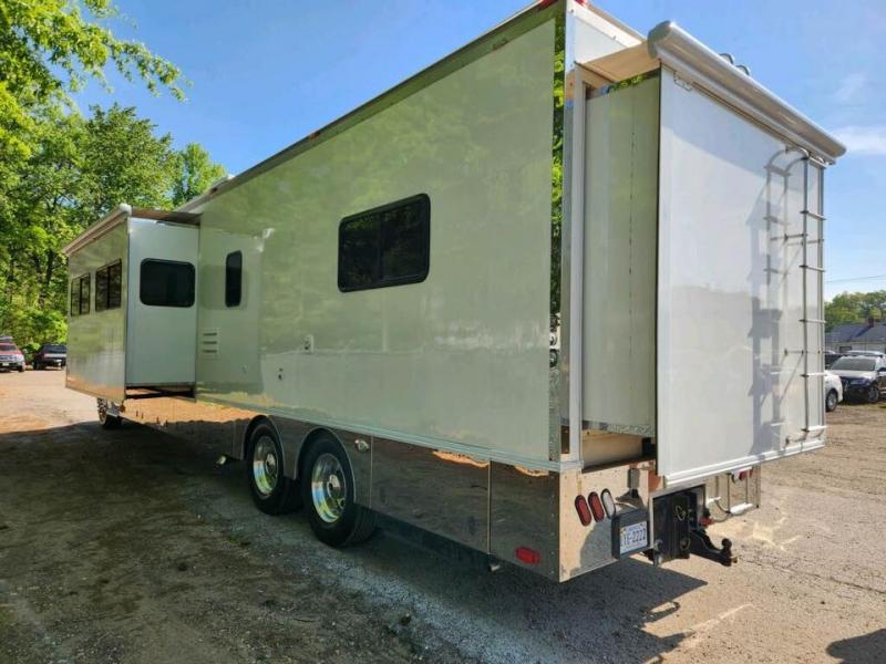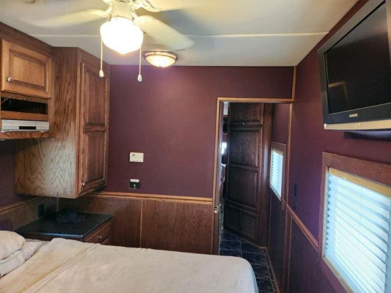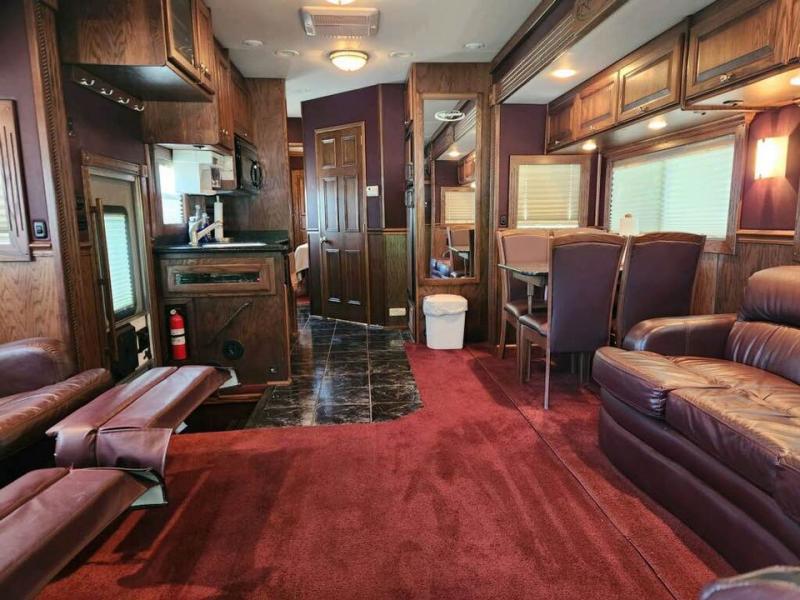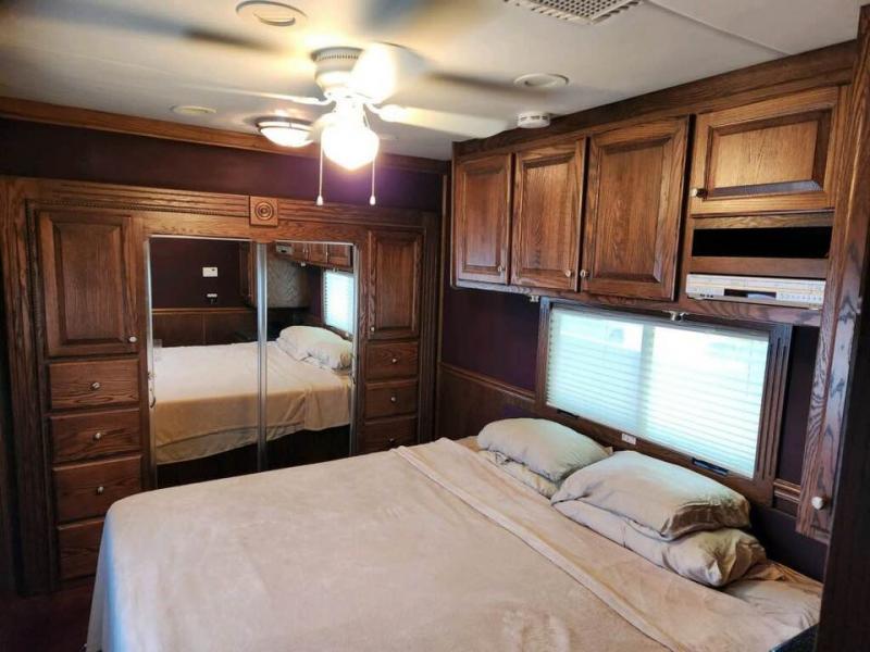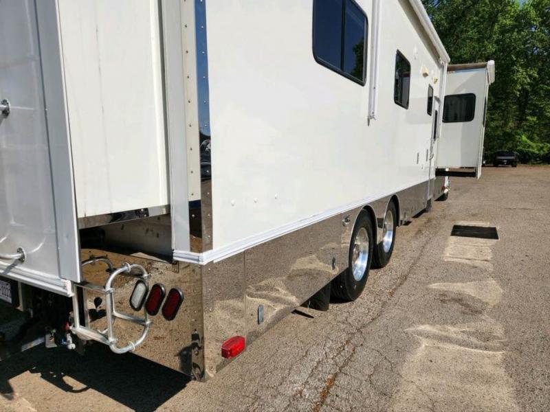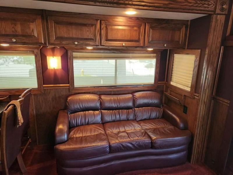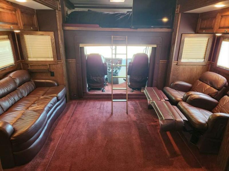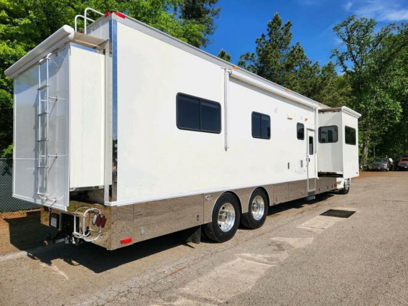New tires installed 2019, outdoor entertainment center, outdoor cooler, outdoor grill, Patio Awning, Large Mid-Bath, Bunk over Cab, Sofa with Air Mattress Hide-A-Bed, Table with 4 chairs, 2 recliners in passenger front side, Queen size bed in Master, 12,500kw Onan Diesel Generator, 40,000lb hitch, Automatic leveling system!