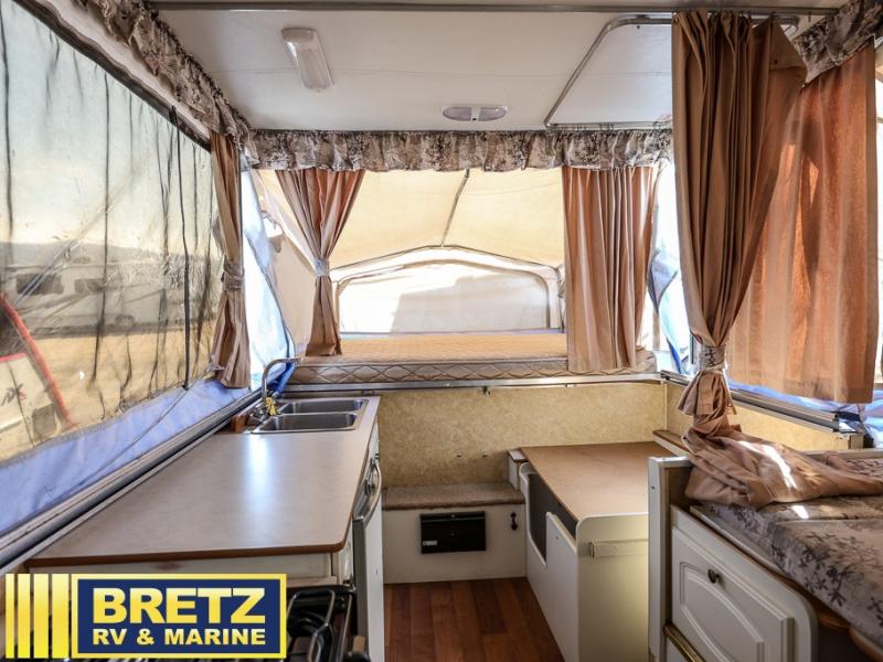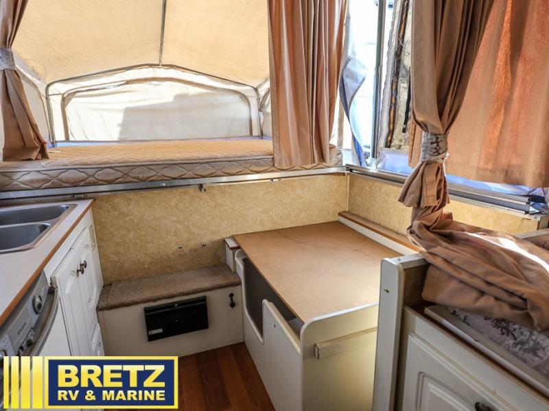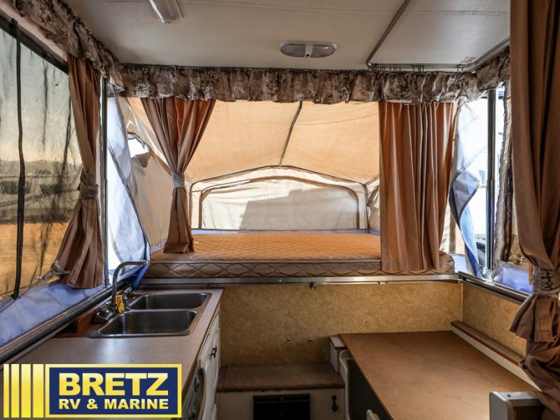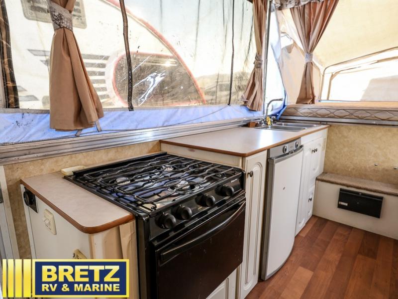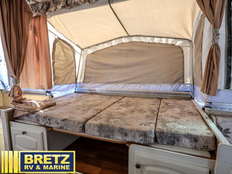 Two King Size Tent End Beds, L-Shaped Bench Seat w/Storage, Shower & Cassette Toilet, Slideout Booth Dinette, Stor-A-Way Storage Steps, 3 Burner Cooktop, Double Kitchen Sink, Refrigerator, Plenty of Storage and More.