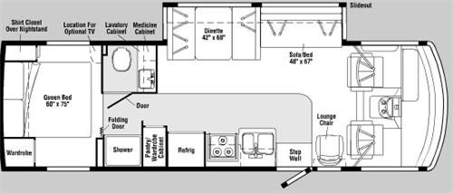 Single Slide, Rear Queen Bed, Wardrobe, Shirt Closet/Nightstand Below, Opt. TV, Shower, Pantry/Wardrobe Closet, Medicine Cabinet, Refrigerator, 3 Burner Range, Double Kitchen Sink, Booth Dinette, Sofa Bed, Lounge Chair, Step Well, Opt. Engine & Chassis, and More.