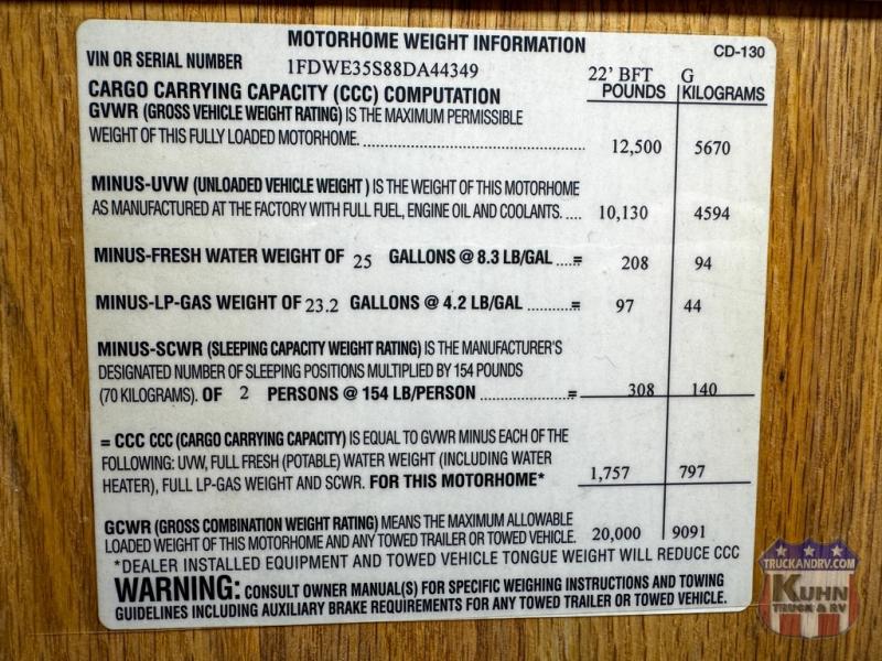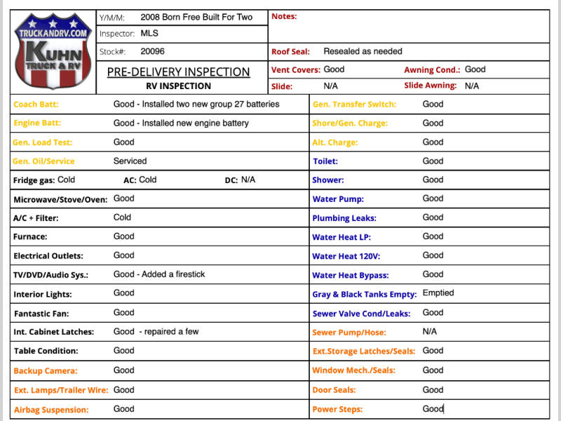 2008 Born Free Built for Two - 22.5' bumper to bumper - 6.8L Triton V10 engine - Ford E350 chassis - Fully Self Contained - Tow package - 3 burner LP cooktop - Microwave/convection oven - 6 NEW TIRES - 8 SEAT BELTS - Generac 4k generator with 20 hours - Rooftop A/C - Ducted LP furnace - Flat screen TV - Holding tanks - In the cabin area there are power windows, locks, and mirrors, tilt, cruise, and CD player - This Born Free is ready to roar on your next adventure!
