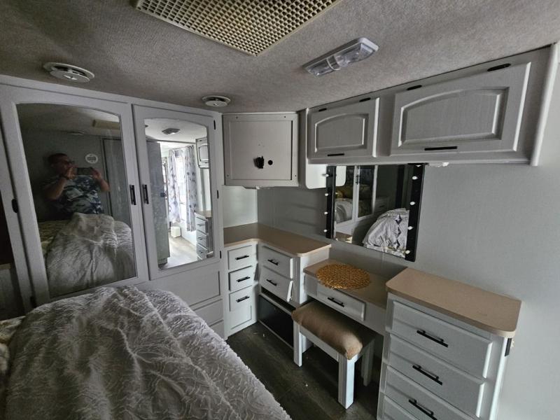 Rear Queen Bed Slideout, 2 Barrel Chairs w/End Table in Bedroom, Wardrobe Slideout, Seperate Stool Room, Angle Shower, Booth Dinette & Hide-A-Bed Slideout w/Seatbelts, Lounge Chair w/Ottoman, Double Kitchen Sink, 3 Burner Range, Refrigerator, Double Kitchen Sink, Pantry and More.