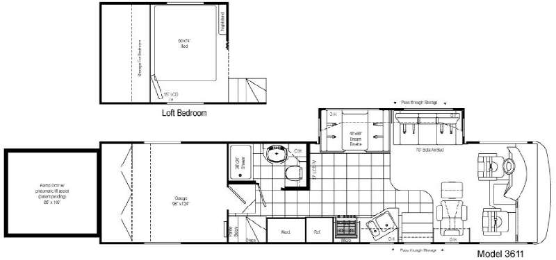 Single Slide Outlaw Class A Toy Hauler w/Rear Ramp Door & Pneumatic Lift Assist to 8'x10'4" Garage Space w/Loft Bedroom Above, Loft Storage, 15" LCD TV, Nightstand, Tub/Shower, Lav., Overhead Cabinet, Wardrobe, Refrigerator, 3 Burner Range w/Microwave Above, Double Kitchen Sink, Dream Dinette & Sofa Air Bed Slideout, Pass-Thru Storage, Opt. Queen Electric Bed in Garage Area for Extra Sleeping, Chassis Choice and Much More. Workhorse Specifications Shown, Ford Available.
