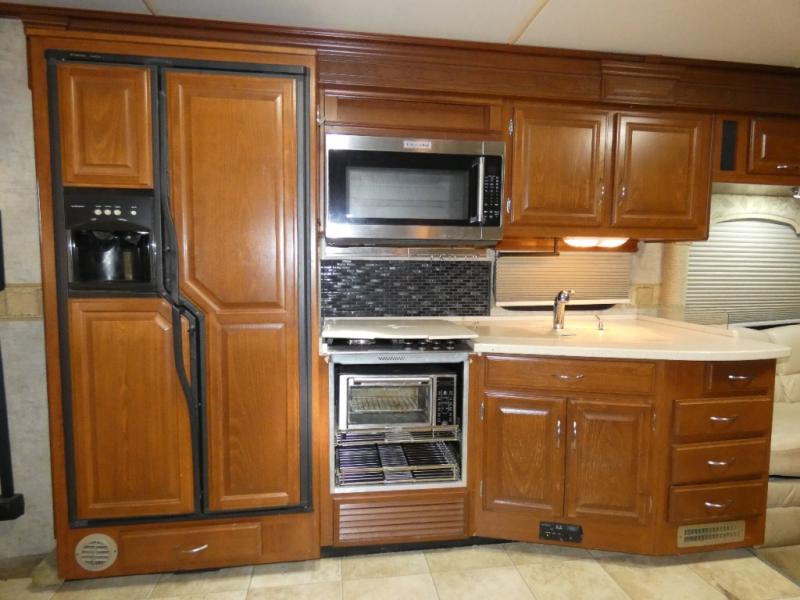 Triple Slide Class A Motor Home, Rear Bathroom w/Shower, Private Toilet Area w/Lavatory, Wardrobe, Slide Out Queen Bed, Dbl. Nightstands, Half Bath w/Toilet & Sink, Slide Out Enter. Center/Loveseat/Double Kitchen Sink/3 Burner Range/Refrigerator, Slide Out Sofa/Booth Dinette and More.