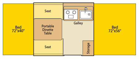 Front Full & Rear Single Tent End Beds, Portable Dinette Table, Fold-Over Galley w/2 Burner Cook Top Stove & Sink, Storage Cabinet, Opt. Furnace, Bike Mount and Much More.