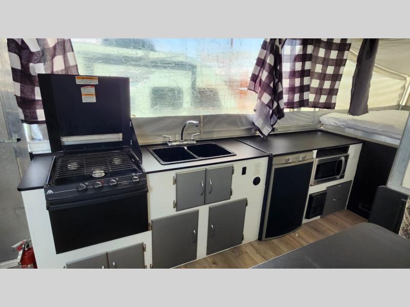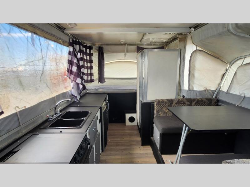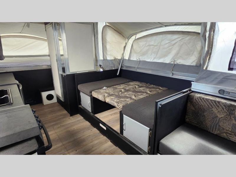 Looking for a lightweight, low-profile travel trailer with room for toys? This Pop-Up has more than enough room to be comfortable with up to 6 people thanks to the front & rear pop-out beds as well as the manual dinette slide-out. The kitchen has everything you need to whip up delicious meals for the everyone. Plus it is equipped with a porta-poti bathroom with full privacy dividers. The coolest feature has to be the front hauler space complete with removable sidewalls that double as ramps so you can easily bring your motorcycles, kayaks or any other outdoor toys along with you. Also a great option for hunters! Come see it today!