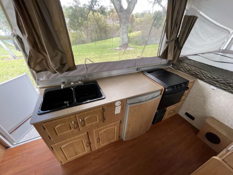 Folding Camping Trailer w/Two King Tent End Beds, Solid Walled Bathroom w/Shower & Flushable Commode, Slideout Portable Dinette Table, Bench Seating w/Storage Below, Double Kitchen Sink, 3 Burner Range, Storage, Outdoor RVQ Grill and More.