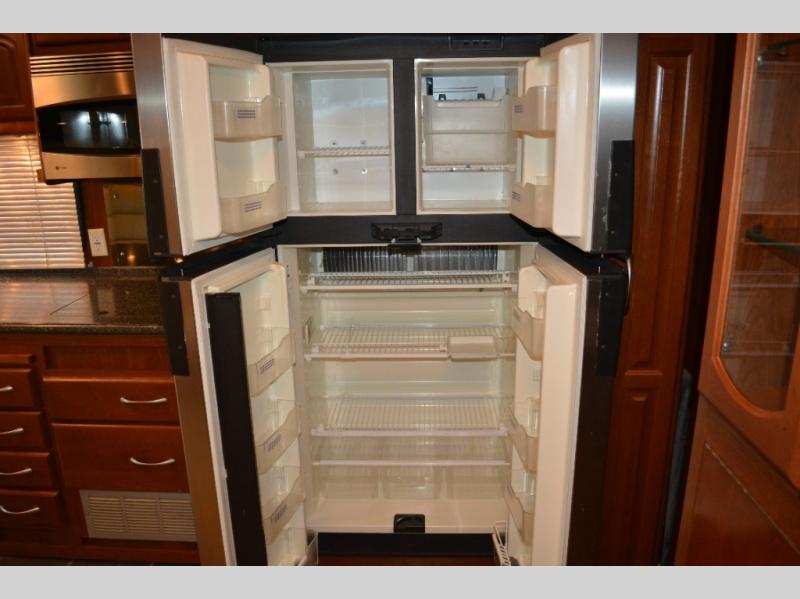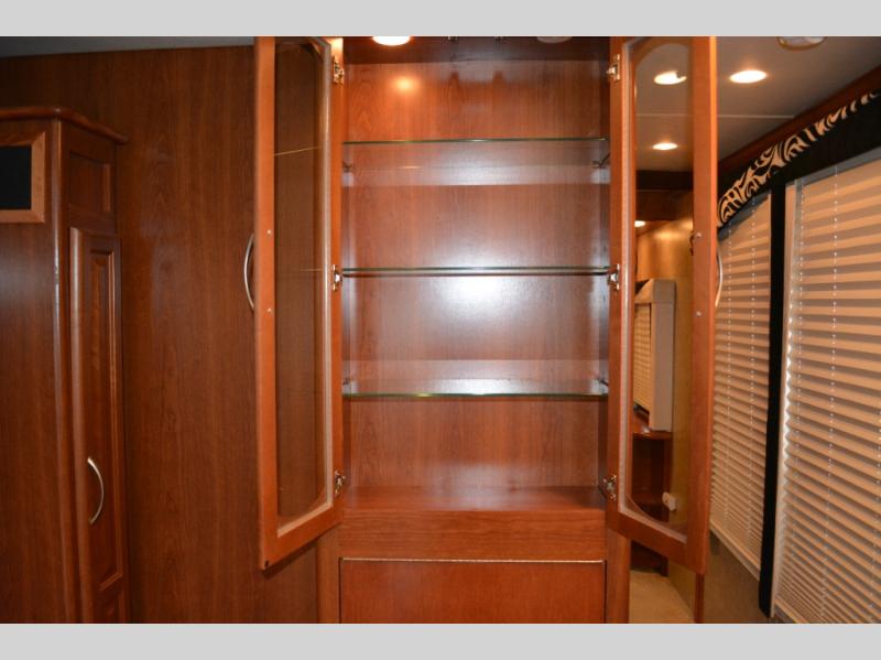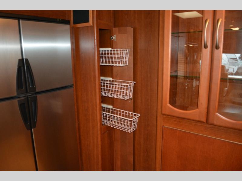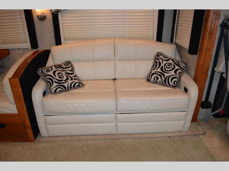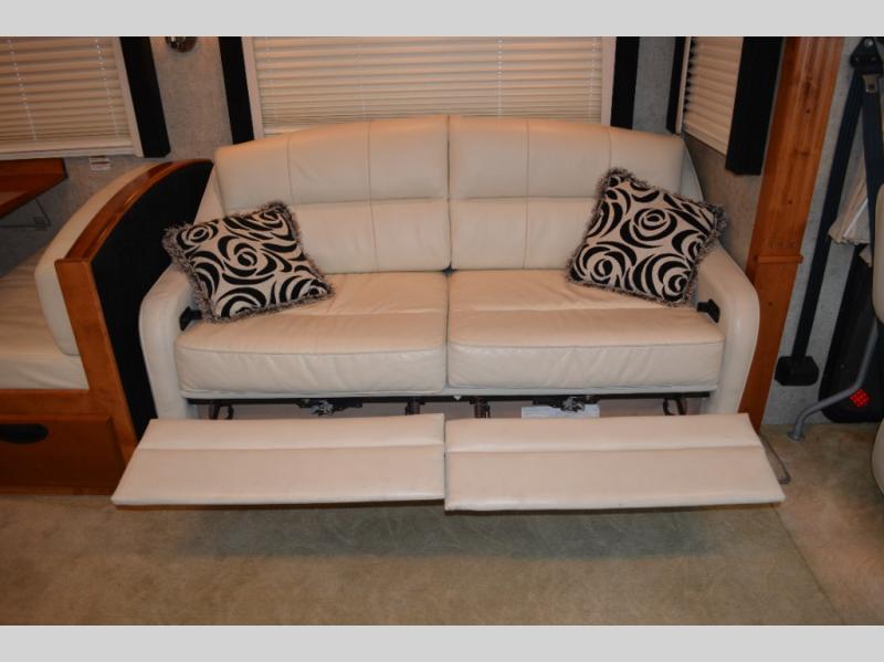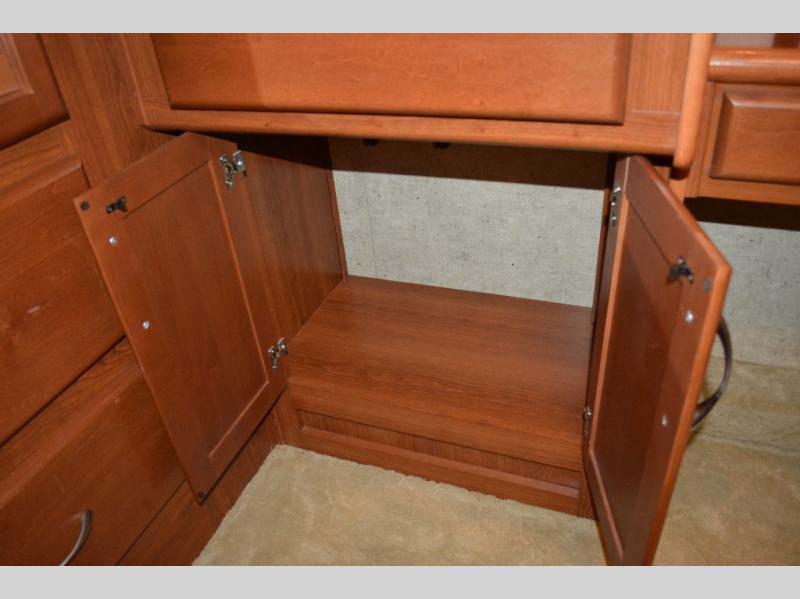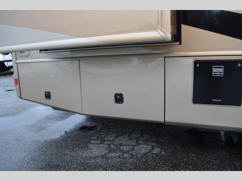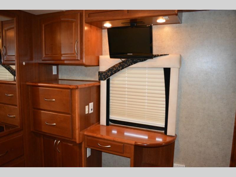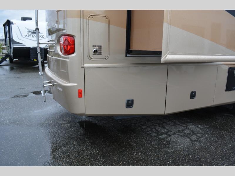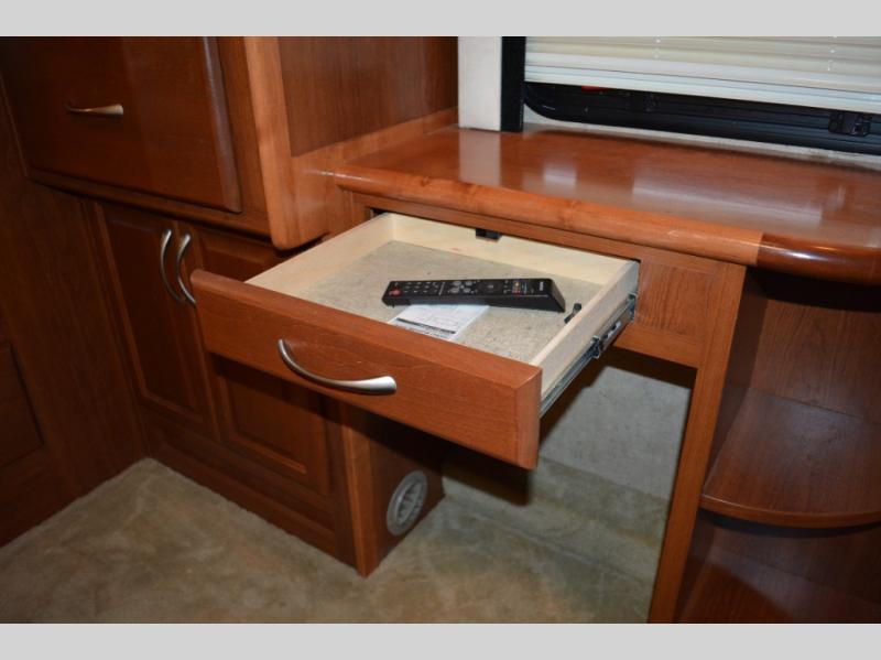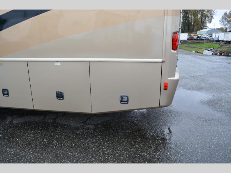 Triple Slide Class A Motorhome w/Rear Bedroom Including a Rear Wardrobe, Storage Cabinet, TV/Desk, Queen Bed Slide w/Nightstands, Side Isle Bath w/Angle Shower, Lav., Double Bath Entrance, Pantry, Utility Cabinet, Refrig./2 Burner Cooktop w/Microwave Above & Double Kitchen Sink Slideout, Recliner, Sofa Bed & Round Dinette w/Chairs Slideout and More. Shown w/Ford Specifications. See us for Workhorse Specs.
