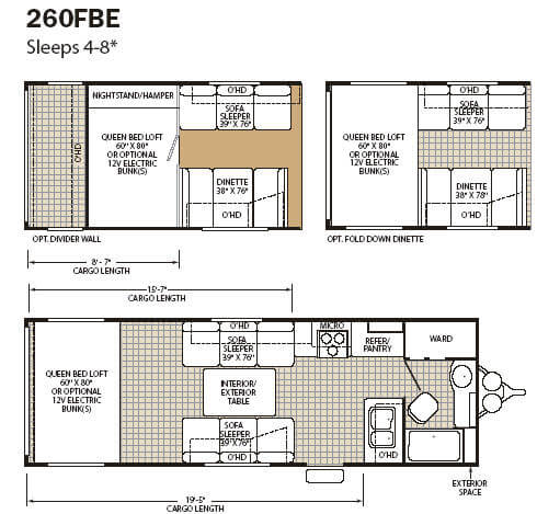 Rear Ramp Door to 19 Ft. 5 In. Toy Parking Space, Queen Bed Loft or Opt. Queen Electric Bunks w/Opt. Wall Divider, 2 Sofa Sleepers w/Table Between or Fold Down Dinette IPO 1 Sofa Sleeper, Microwave, 3 Burner Range, Refrigerator/Pantry, Double Kitchen Sink, Front Bath w/Wardrobe, Tub/Shower, Lav. and Much More.