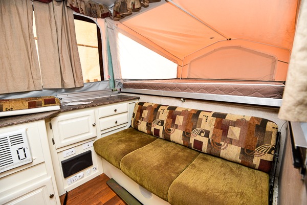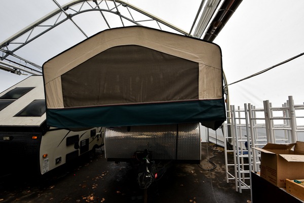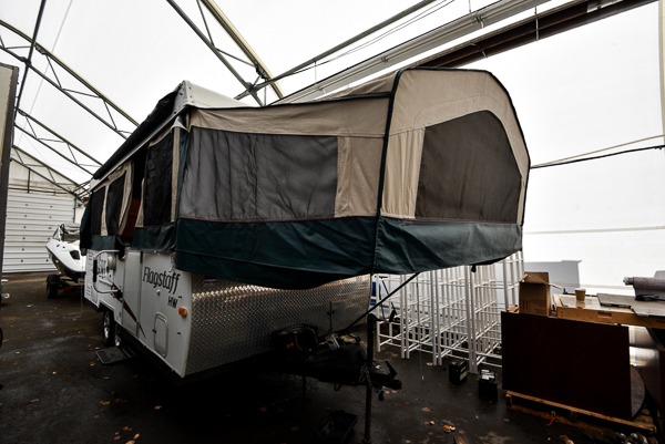 Flagstaff High Wall Folding Pop-Up Camper w/Slideout U-Dinette, Front King Tent End Bed & Rear Queen, Refrigerator Cabinet, Microwave, Double Kitchen Sink, 3 Burner Range, Sofa, Water Heater, Opt. Heater, Shower/Cassette Toilet, RVQue Gas Grill and Much More.