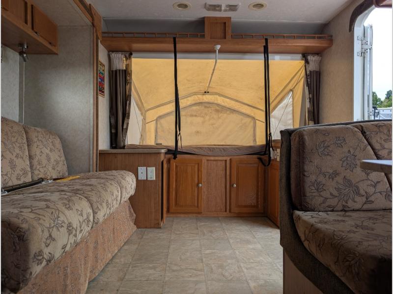 Single Slide, Front & Rear Queen Tent End Beds, Angle Shower, Med. Cabinet, Lav., Wardrobe, Pantry, Refrigerator, 3 Burner Range, Double Kitchen Sink, Sofa, Booth Dinette, Ent. Center, Nightstand, Overhead Cabinets and More.