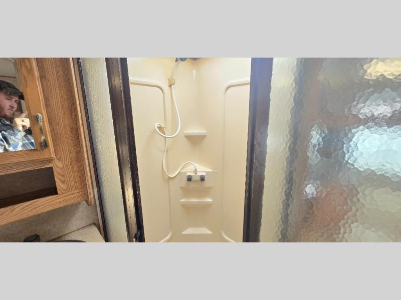Double Slide Fifth Wheel, Rear Recliner, Overhead Cabinets, Ent. Center, 2nd Recliner, Dbl. Kitchen Sink, Microwave, Pantry, Slide Out Sofa & Booth Dinette w/Picture Window & Overhead Cab., Refrigerator, Step Up Bath/Bedroom w/Private Toilet Area, Shower, Sink, Front Bedroom, Slide Out Queen Bed, Wardrobe w/Glass Doors Below, Drawers, Overhead Cab. and More.