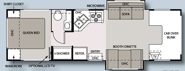Double Slide Class C Motorhome w/Rear MEGA Storage, Rear Queen Bed w/Shirt Closet & Wardrobe, Opt. LCD TV, Shower, Separate Stool Room, Double Kitchen Sink, 3 Burner Range, Microwave, Booth Dinette & Sofa Slideouts, TV, Bunk Over Cab Area w/Opt. Front Ent. Center and More.