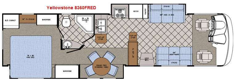 Double Slide Yellowstone Front End Diesel Motor Home w/Rear King Bed Slideout Including Wardrobe & Round Dining Table & Chairs Area, In Bedroom Enjoy Washer/Dryer Cabinet, 19" TV Overhead, 2nd Wardrobe, Side Aisle Bath w/Double Entrance, Vanity w/Sink, Angle Shower, Double Kitchen Sink w/Overhead Cabinet, Flip-Up Counter, 3 Burner Range/Refrigerator/Pantry & Hide-A-Bed Slideout, Jack-Knife Sofa, 32" LCD TV w/Flip Up Counter and More!