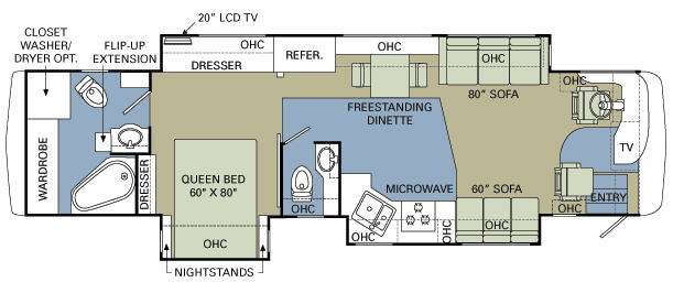 Triple Slide Ambassador by Holiday Rambler, Rear Bath w/Wardrobe, Linen Washer/Dryer Opt., Lav. Tub/Shower, Flip-Up Ext., Queen Bed Slideout w/Nightstands, Dresser w/20" LCD TV Overhead/Pantry/Refrigerator/Free Standing Dinette w/Chairs & 80" Sofa Full Wall Driver's Side Slideout, TV Above Cab Area, 60" Sofa/3 Burner Range w/Microwave & Double Kitchen Sink Slideout, 2nd 1/2 Bath and Much More.
