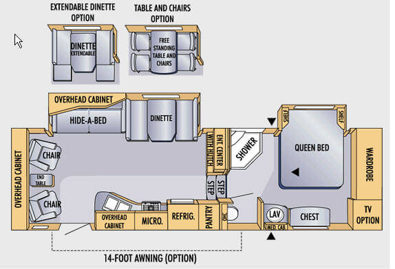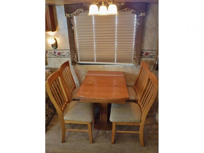 Double Slide, Rear Living Area w/2 Chairs, Hide-A-Bed & Booth Dinette Slideout, or Choice of Free Standing Table & Chairs or Booth w/Extension, Ent. Center w/Hutch, Angle Shower, Front Queen Bed Slideout, Wardrobe, Optional TV, Chest, Lav. Pantry, Refrigerator, 3 Burner Range, Microwave, Double Kitchen Sink, and Much More.
