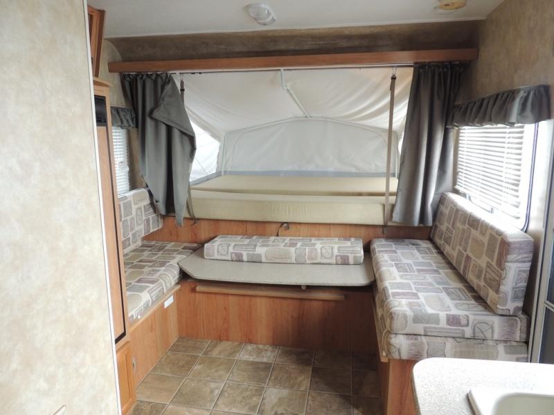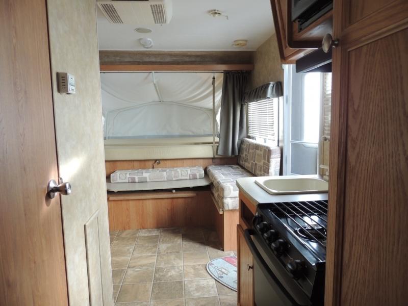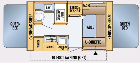 Front & Rear Queen Tent End Beds, Rear Overhead Shelf, Pantry, 3 Burner Range, Microwave, Sink, Tub/Shower, Lav., Refrigerator/TV Shelf Above, U-Shaped Dinette w/Table, Overhead Shelf in Front, Radio, 10' Opt. Awning & More.