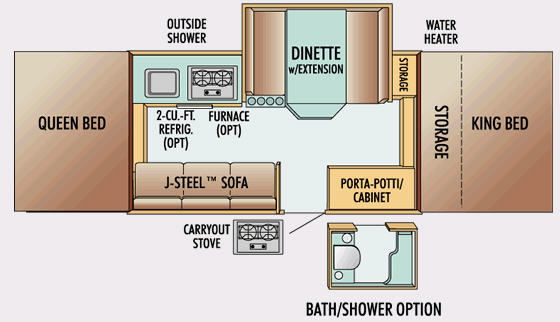 Queen & King Tent End Beds, J-Steel Sofa, Slideout Booth Dinette w/Extension, Porta-Potti Cabinet, Sink, 2 Burner Cooktop, Water Heater, Carryout Stove, Storage Cabinets, Outside Shower and More.
