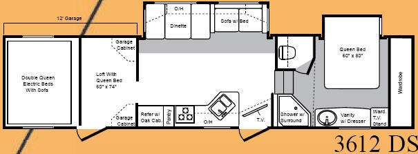 Double Slide Raptor FW Toy Hauler w/Rear Ramp Door to 12' Garage Cargo Space, Opt. Double Queen Electric Beds w/Sofa in Cargo Area, Loft w/Queen Bed, Side Entrance Door in Cargo Space, 2 Corner Garage Cabinets, Booth Dinette & Sofa w/Bed Slideout, Refrig. w/Oak Cab., Pantry, 3 Burner Range, Double Kitchen Sink, TV, Angle Shower w/Surround, Private Toilet Area, Vanity w/Dresser & Sink, Front Queen Bed Slide, Wardrobe, TV Stand & Much More!