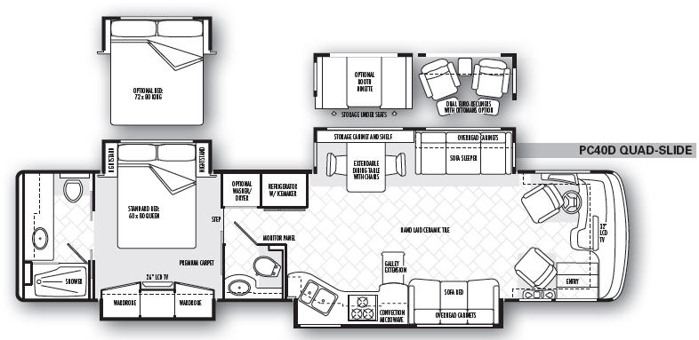 Quad Slide, Rear Master Bath w/Shower, Sink, Toilet, Slide Out Queen Bed, Slide Out Wardrobes/LCD TV, Private Toilet Area w/Sink, Washer/Dryer Prep, Refrigerator, Slide Out Double Kitchen Sink/3 Burner Range/ Microwave/Sofa Bed, Slide Out Dining Table & Chairs/ Sofa Sleeper, and Much More.