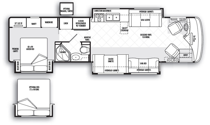 Triple Slide, Rear Bedroom, Slide Out Queen Bed/Nightstands, 19" LCD TV, Vanity, Wardrobe, Linen, 4-Door Refrigerator, Shower, Toilet, Sink, Slide Out Booth Dinette/Sofa Bed, Slide Out 3 Burner Range/Double Kitchen Sink/Sofa Sleeper, and More.