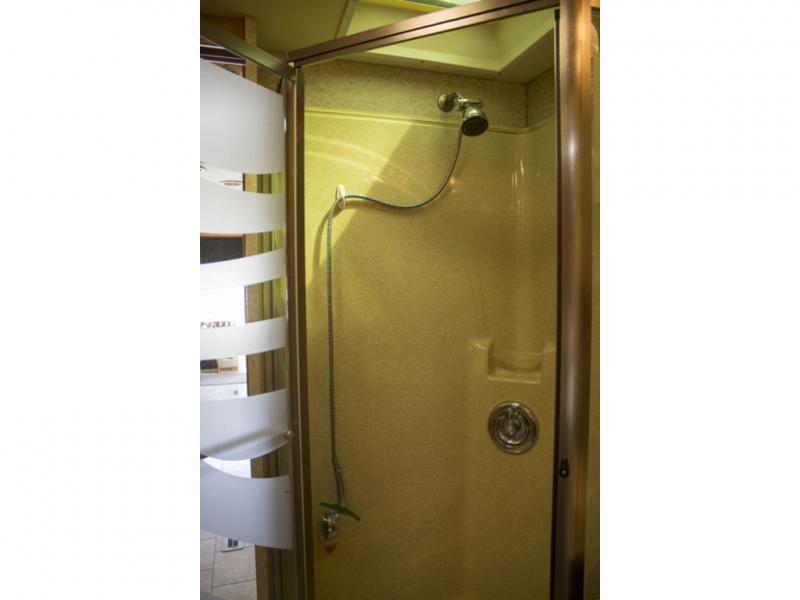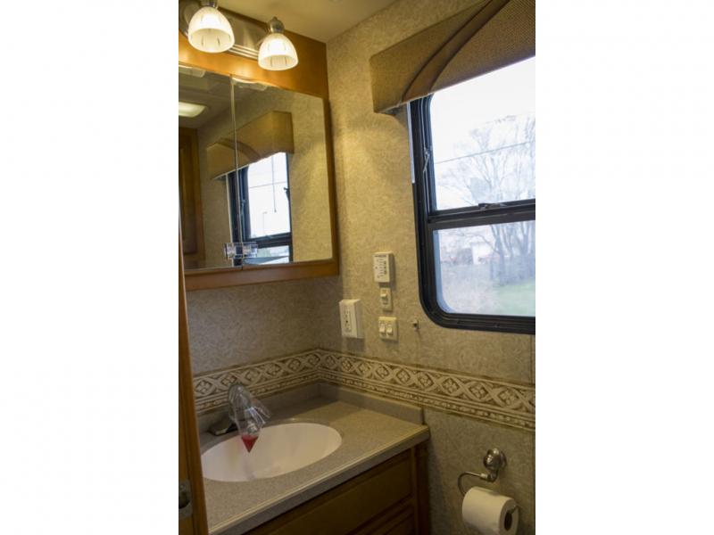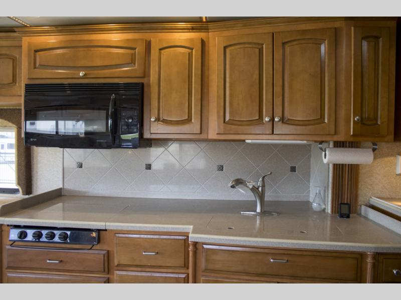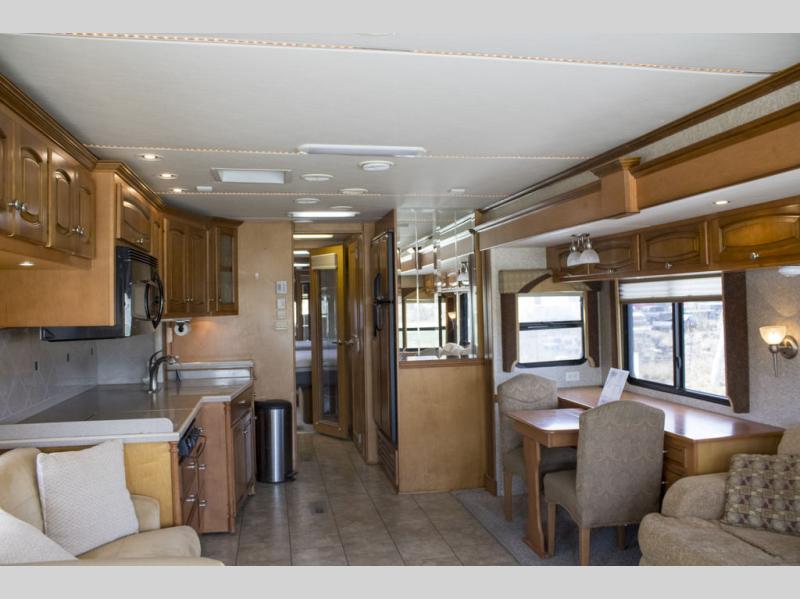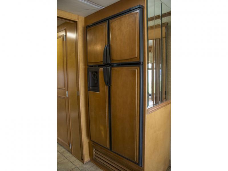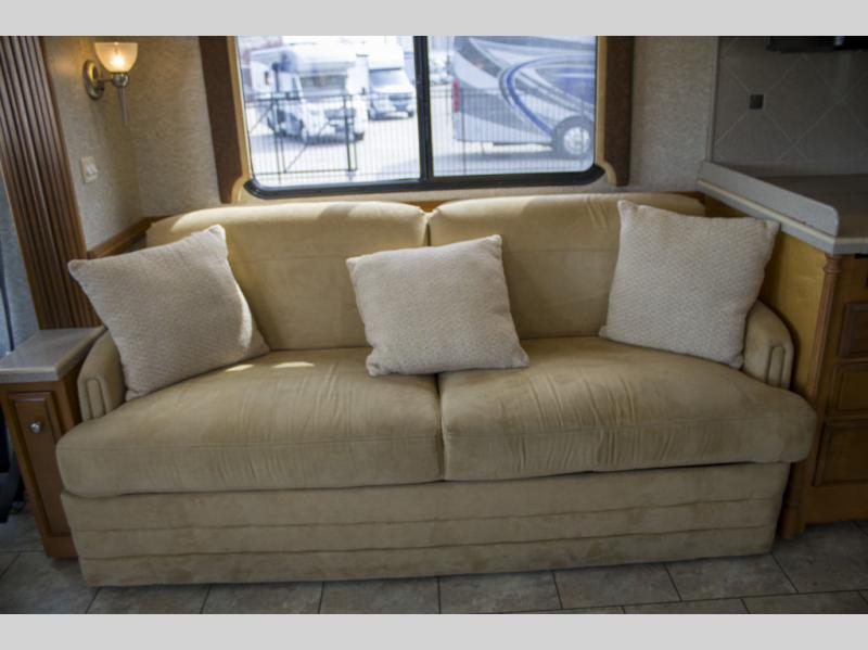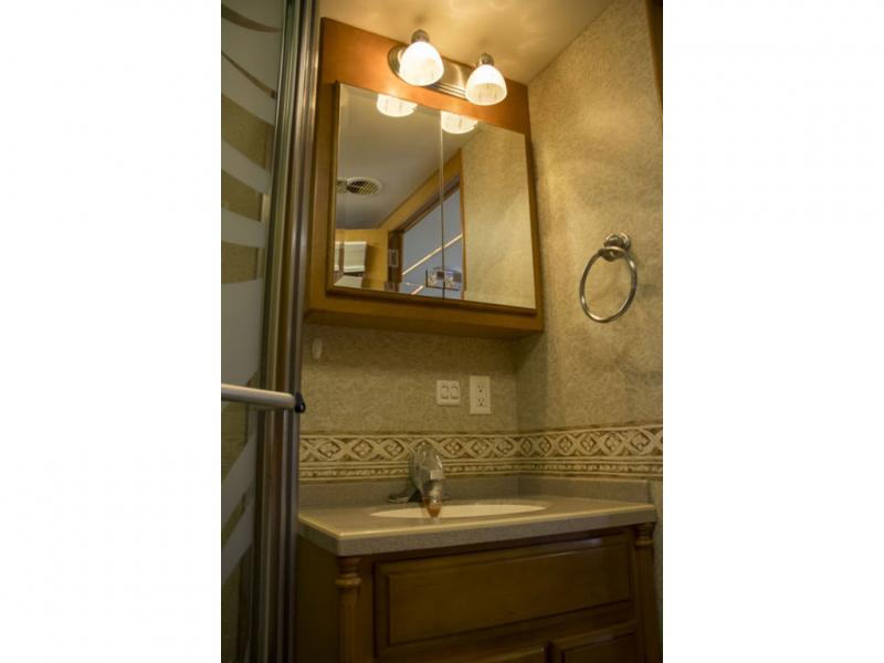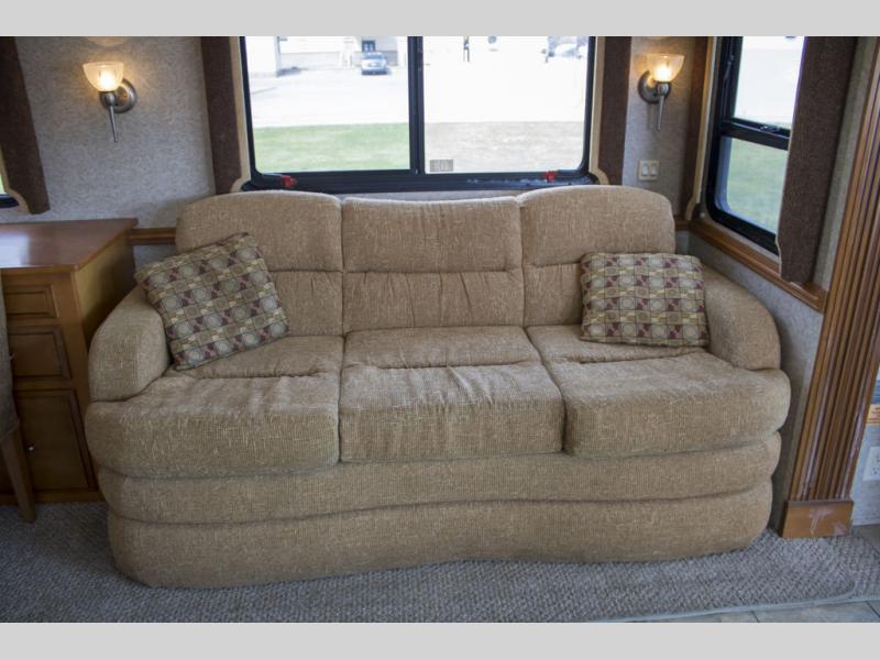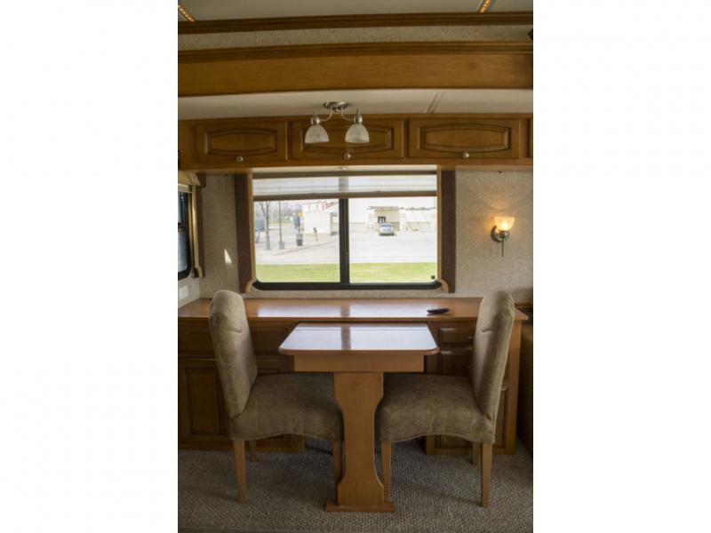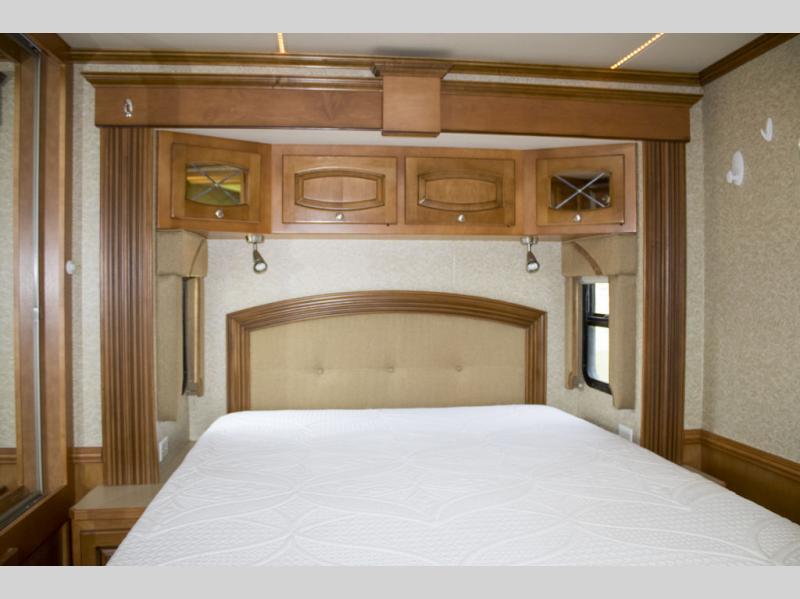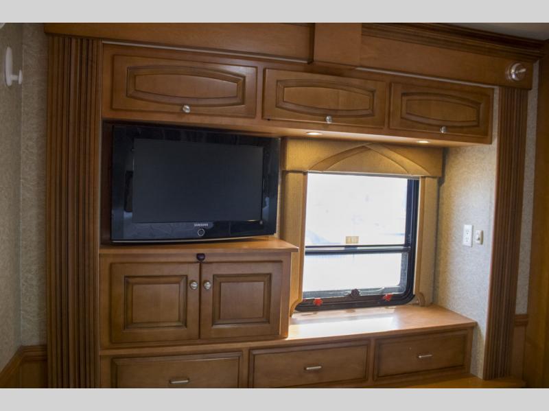 Quad Slide, Rear Side Queen Bed Slide, Overhead Cab., Dresser & TV/Storage Slideout, Wardrobe or Wash/Dryer, Wardrobe w/Mirrored Sliding Doors, Angle Shower, Lav., Stool Room w/Lav., Refrigerator, Pantry, Hide-A-Leaf Dinette w/4 Chairs & Sofa Slide, 2nd Sofa/3 Burner Range & Double Kitchen Sink Slideout, TV Above Cab Area and Much More.