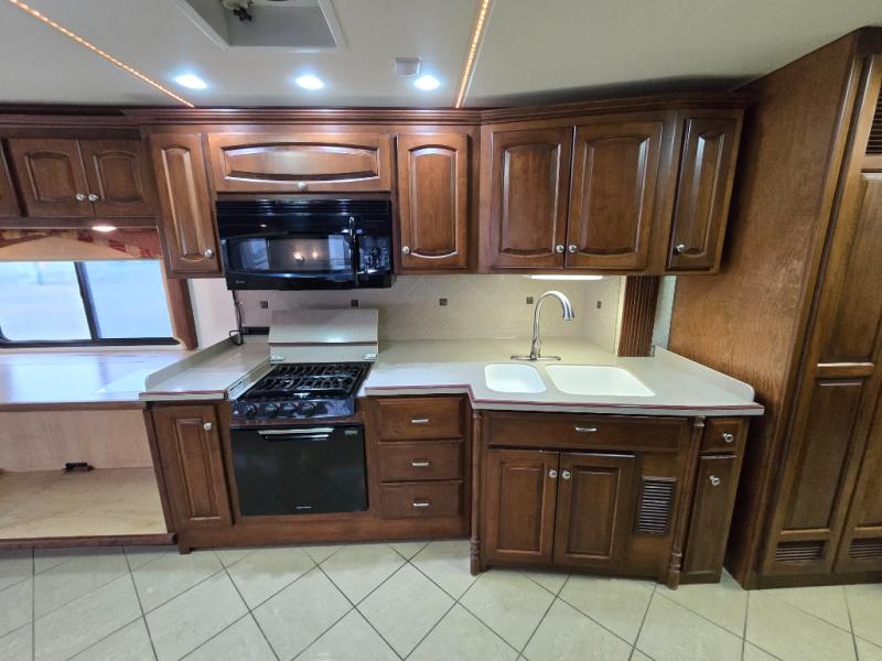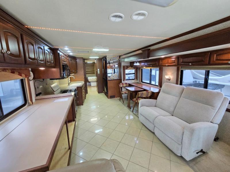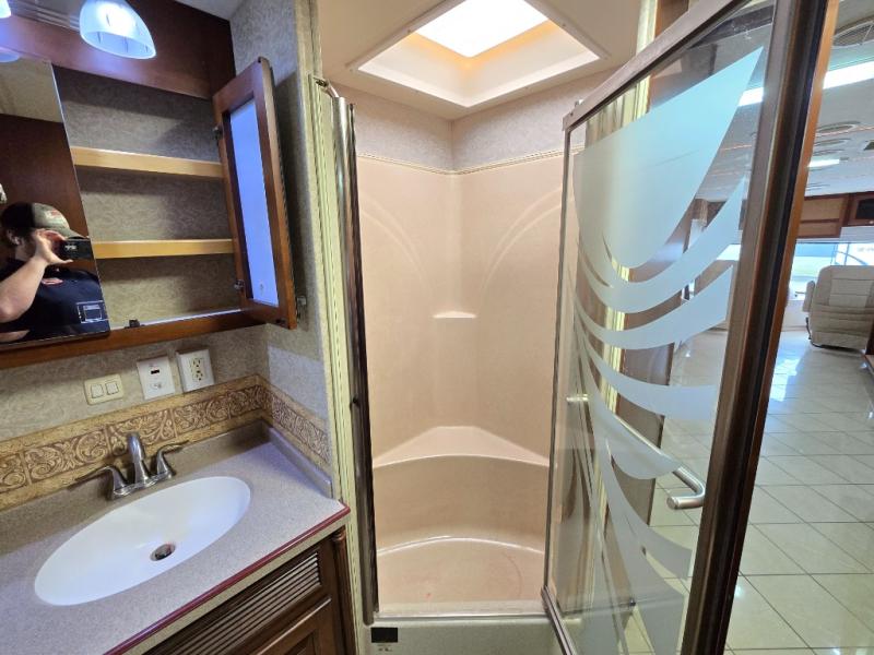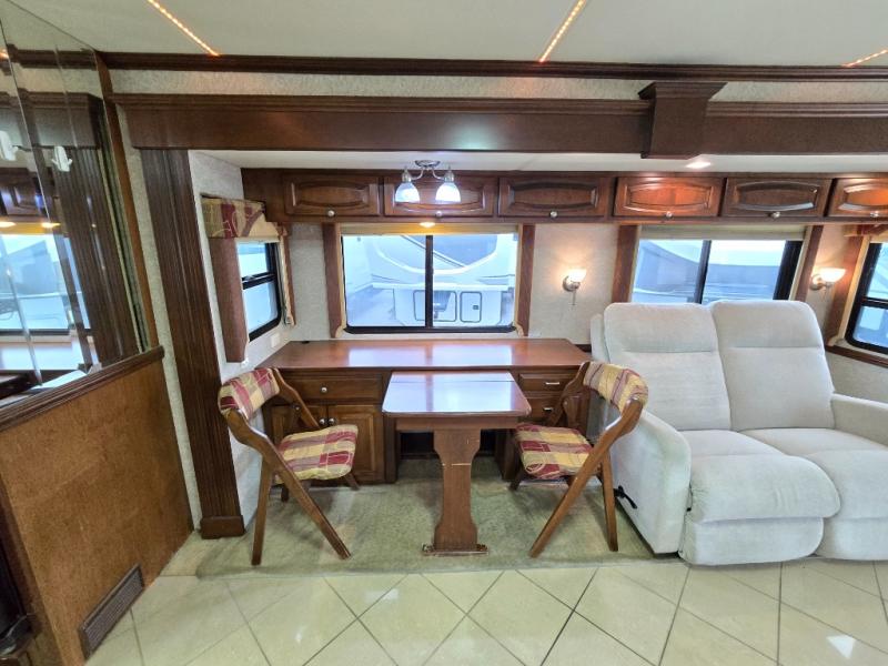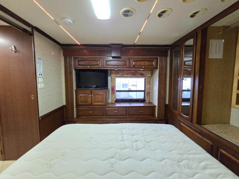 Quad Slide, King Bed Slide, Ward. w/Sliding Mirrored Doors, Storage, Dresser & TV/Storage Cabinet Slideout, Angle Shower & Lav., Stool Room w/Lav., Wash/Dryer, Refrigerator, 2 Pantry, Double Kitchen Sink/3 Burner Range & Sofa Slideout, Hide-A-Leaf Dinette w/Chairs (2 Folding) & 2nd Sofa Slideout, TV Above Cab Area and More.