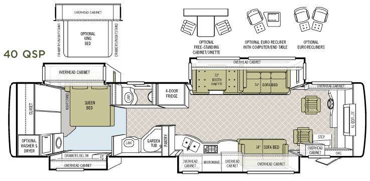 Quad Slide Allegro Bus Class A w/Rear Queen or Opt. King Bed Slide w/Nightstand & Overhead Cabinet, Closet, Opt. Washer/Dryer, Drawes w/Overhead Storage & 26" TV Slide, Garden Tub & Lav., Private Toilet Area, 4 Door Refrigerator, Pantry, Double Kitchen Sink/2 Burner Range & Sofa Bed Slideout, Booth or Free Standing Dinette Opt. & 2nd Sofa Bed or Euro Recliner Opts. Slideout, 32" LCD TV Above Cab Area and So Much More! Specifications Shown for Freightliner Chassis. See us for Spartan Specs.