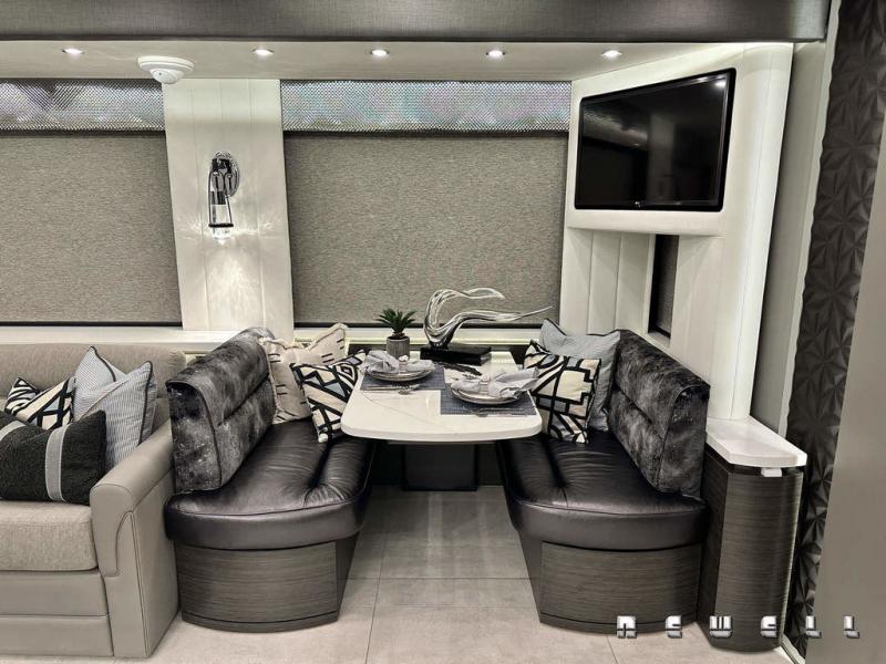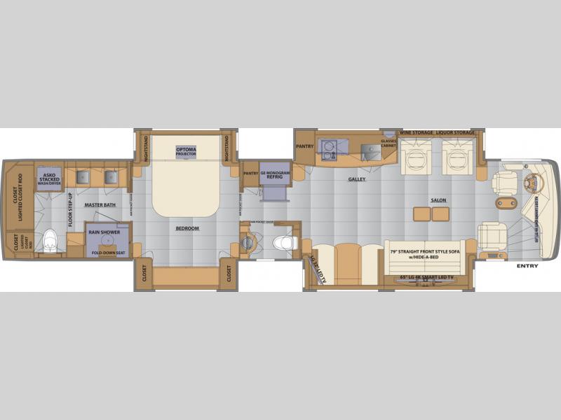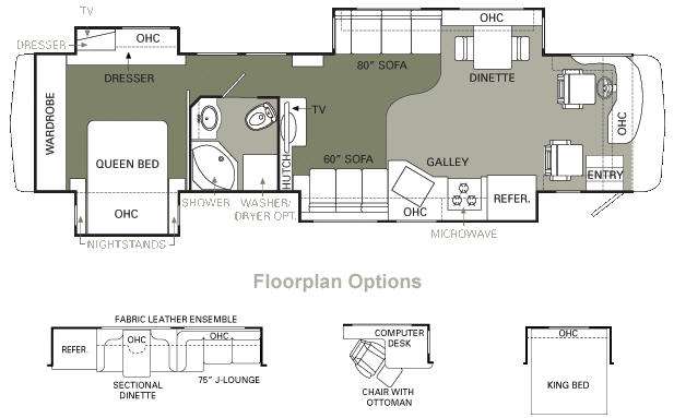 Quad Slide Monterey Class A Diesel, Rear Queen Bed w/Nightstands Slide Out, Ward., TV/Dresser/Overhead Cab. Slide Out, Corner Shower, Lav., Toilet, Washer/Dryer Opt., TV, Free Standing Dinette w/Chairs/Sofa Slide Out, Sofa/3 Burner Range w/Micro./Single Kit. Sink, Refrig. Slide Out, Hutch, Opt. Refrig./Sectional Dinette/J-Lounge Slide Out, Opt. Computer Desk w/Chair & Ottoman, Opt. King Bed and More.