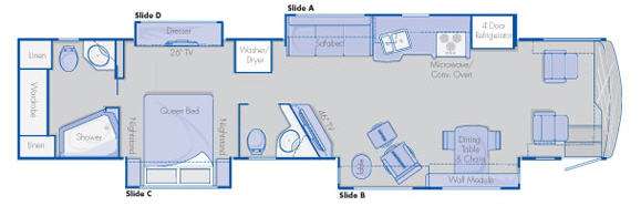 Quad Slide Inspire 360 w/Large Rear Bath, Angle Shower, Lav., Toilet, Dbl. Linen, Ward., Dbl. Slide Out Bedroom w/Dresser Slide Out & Queen Bed Slide Out, Dbl. Nightstands, 26" TV, Washer/Dryer Prep, Half Bath w/Toilet & Lav., Sofabed & Kit. Slide Out, Dbl. Kit. Sink, 3 Burner Range, Micro/Conv. Oven, 4 Door Refrig., 46" TV, Free Standing Dining Table w/Chairs & Lounge Chair w/Ottoman Slide, 2 Front Cab Chairs, Opt. of 3 Seating Arrangements, Opt. Sleeper Sofa Styles & More!
