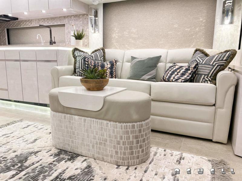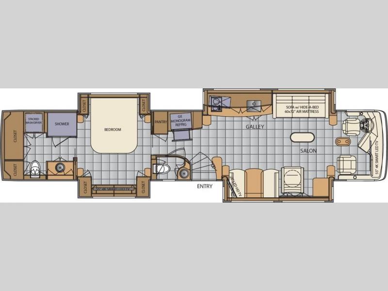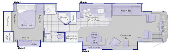 Quad Slide Intrigue 530 by Country Coach w/Rear Bedroom, Wardrobe, Slide Out Queen Bed/Nightstands/Sink, Slide Out Dresser/26'' TV, Private Toilet/Lav. Area, Corner Shower, Side-by-Side Refrigerator, Pantry, Slide Out 2 Burner Range/Mico./Conv. Oven/Kit. Sink/Hide-A-Bed, Slide Out Dining Table & Chairs/Chair & Table, Front Cab Chairs w/Overhead 32" LCD TV, Opt. 6 Seating Arrangements, Opt. 2 Sofabed Styles and More.