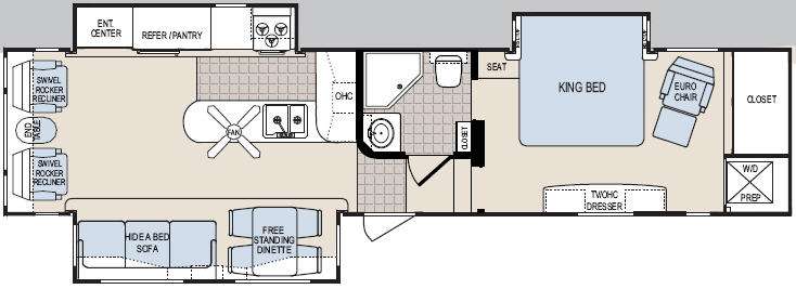 Triple Slide Grand Junction Fifth Wheel by Dutchmen w/Rear Living Space Including 2 Recliners, End Table, Hide-A-Bed Sofa & Free Standing Dinette or Opt. Booth Dinette Slideout, Ceiling Fan, Double Kitchen Sink, Tiered Counter, Overhead Storage, Ent. Center/Refrig./Pantry/3 Burner Range Slideout, Bath w/Angle Shower, Lav., Closet, King Bed Slideout, Ent. Center/Desk/Closet, Euro Chair, Closet w/Sliding Doors, Wash/Dryer Prep and Much More.