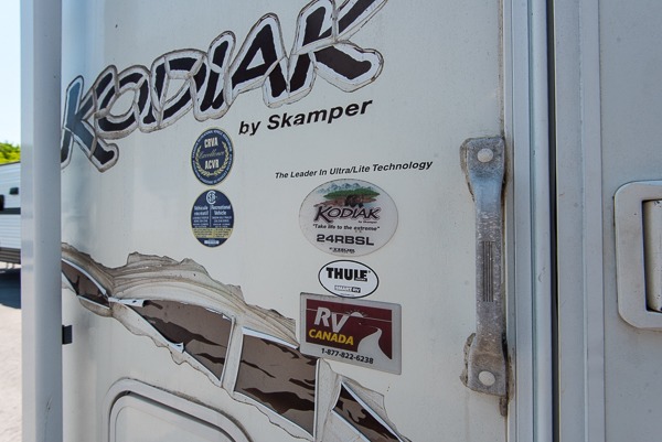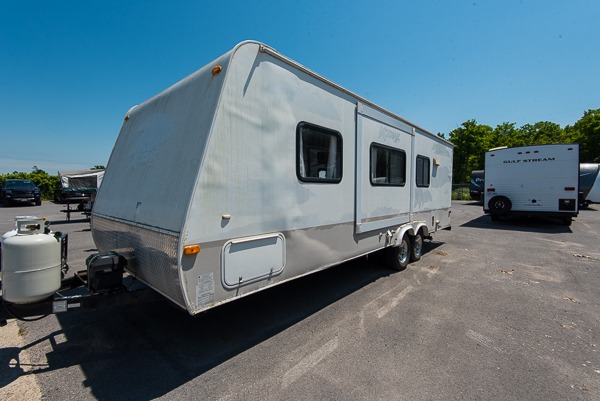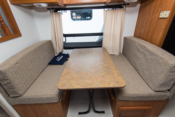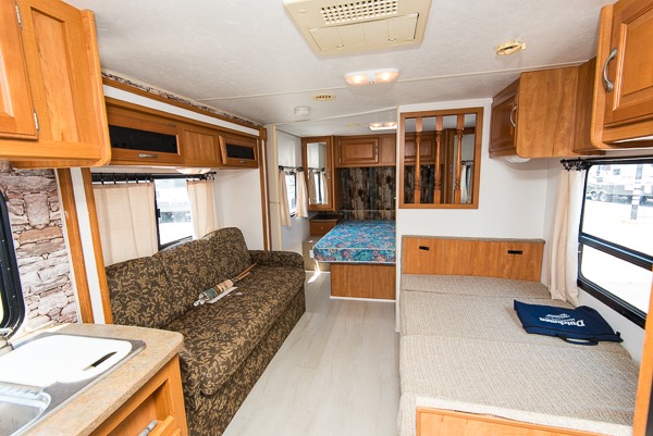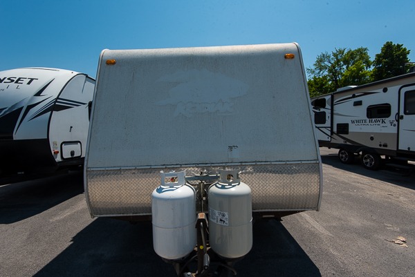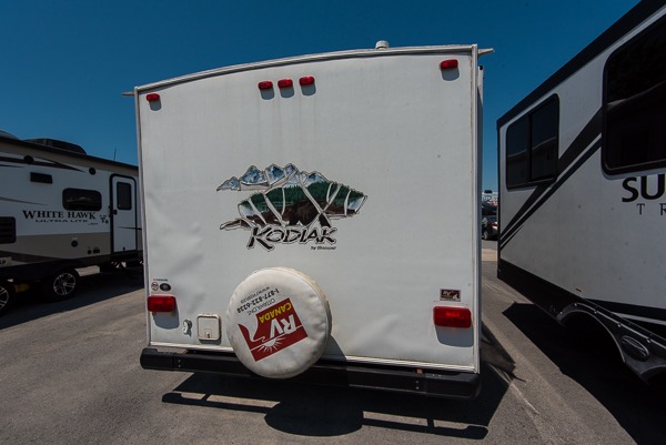 Single Slide Kodiak Travel Trailer by Skamper w/Rear Full Bath Including Wardrobe & Linen Cabinet, Neo-Angle Shower, Lav., Med. Cabinet & Toilet, 3 Burner Range, Double Kitchen Sink, Refrigerator, Booth Dinette w/TV Cabinet Overhead, Sofa Bed Slideout, Front Queen Bed w/Nightstands Below Shirt Closets and More.