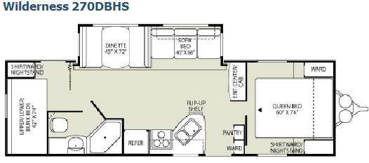 Wilderness Travel Trailer Single Slide, Rear Upper/Lower Bunk Beds, Shirt/Ward. w/Nightstand, Angle Shower, Lavatory, Booth Dinette & Sofa Bed Slideout, Enter. Center/Cab., Pantry, Ward., Dbl. Kitchen Sink, Flip-Up Shelf, 3 Burner Range, Refrig., Front Private Entry Bedroom, Queen Bed, Shirt Wardrobe/Nightstand, 2nd Wardrobe, Overhead Cabinets Throughout and More!